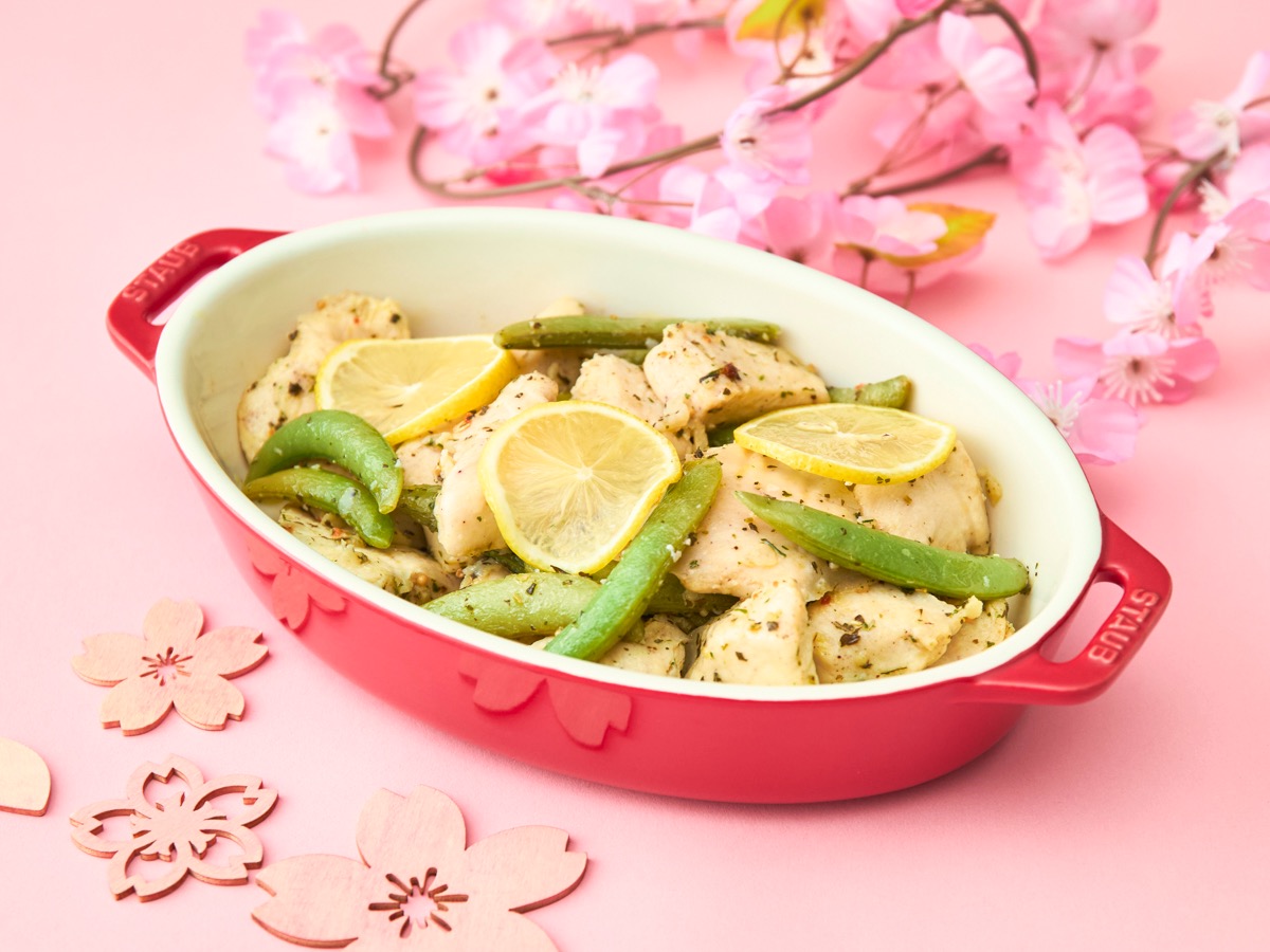 - 春野菜と若鶏の青じそ風味:青じその爽やかな香りが春らしい一皿 。