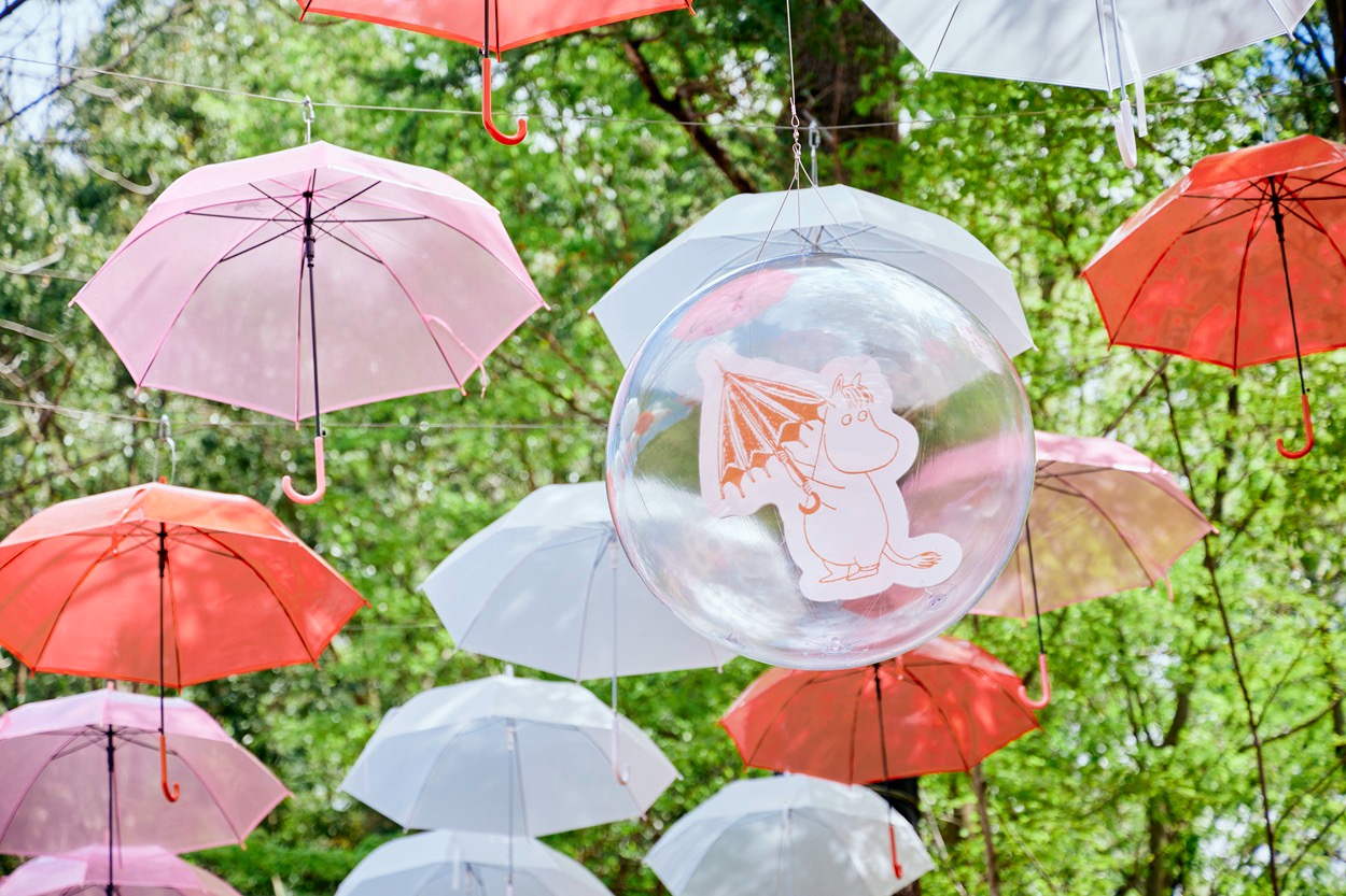 - キャラクターバルーン: 傘の間から『ムーミン谷の彗星』に登場する仲間たちのパネルが顔を覗かせます。