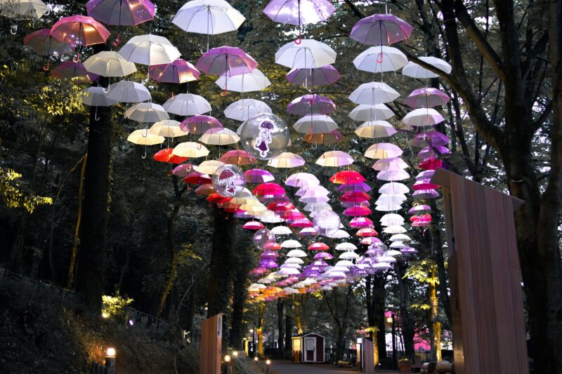 - 連動ライトアップ: 夕方からは傘の配色に合わせたグラデーションのライトアップが実施され、幻想的な雰囲気に包まれます。