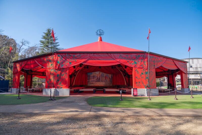 2026年3月14日(土)より、パークのランドマーク「エンマの劇場」が全天候型シアターとして生まれ変わりました。 大型テントや最新の音響・映像システムを完備し、雨の日でも快適に4つの新プログラムを鑑賞できます。