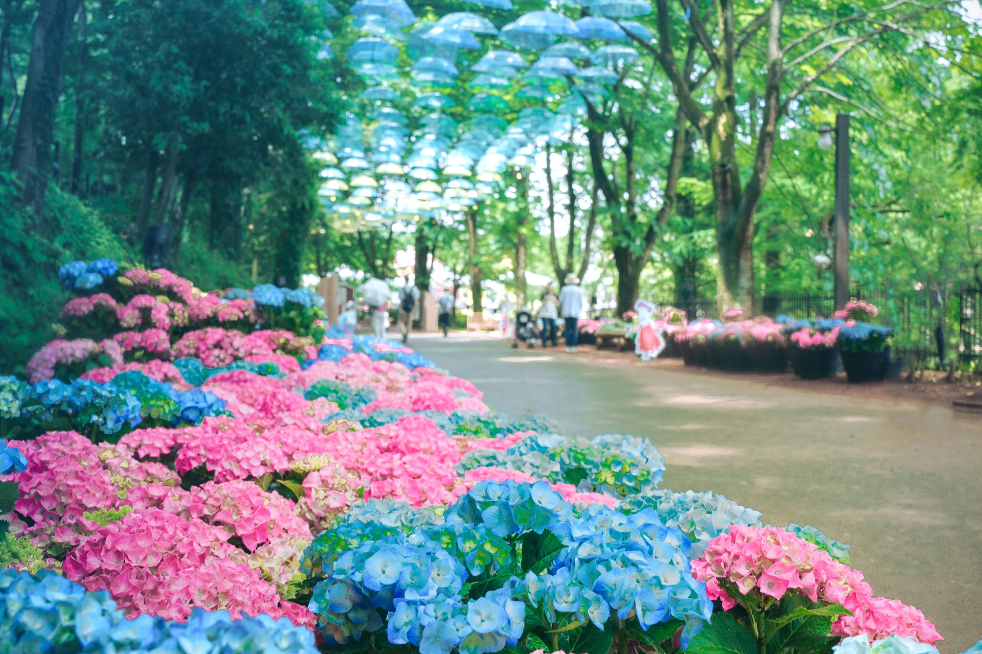 5月中旬からは、地上に咲き誇るあじさいと上空のアンブレラが共演する「アンブレラスカイとあじさいロード」へと進化します。 雨の日のリフレクション(反射)や、時期によって変化する花の色など、天候や季節によって異なる表情を楽しめるのが魅力です。