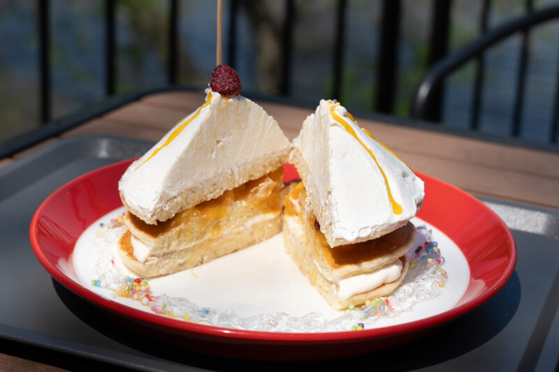 雨粒きらめく マンゴーアンブレラ パンケーキは、まるでリニューアルオープンした、「エンマの劇場」にも見えます。可愛らしい三角の上には、ムーミンバレーパークの旗が誇らしくはためいています。