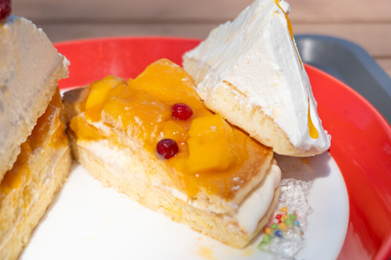 サクッと切り分けると、三角の部分は、たっぷりの生クリーム!そして、パンケーキの上には、マンゴーが、これまた、たっぷりとのっています。マンゴーの甘酸っぱいフレッシュな果実感と、生クリームとの相性が抜群です。