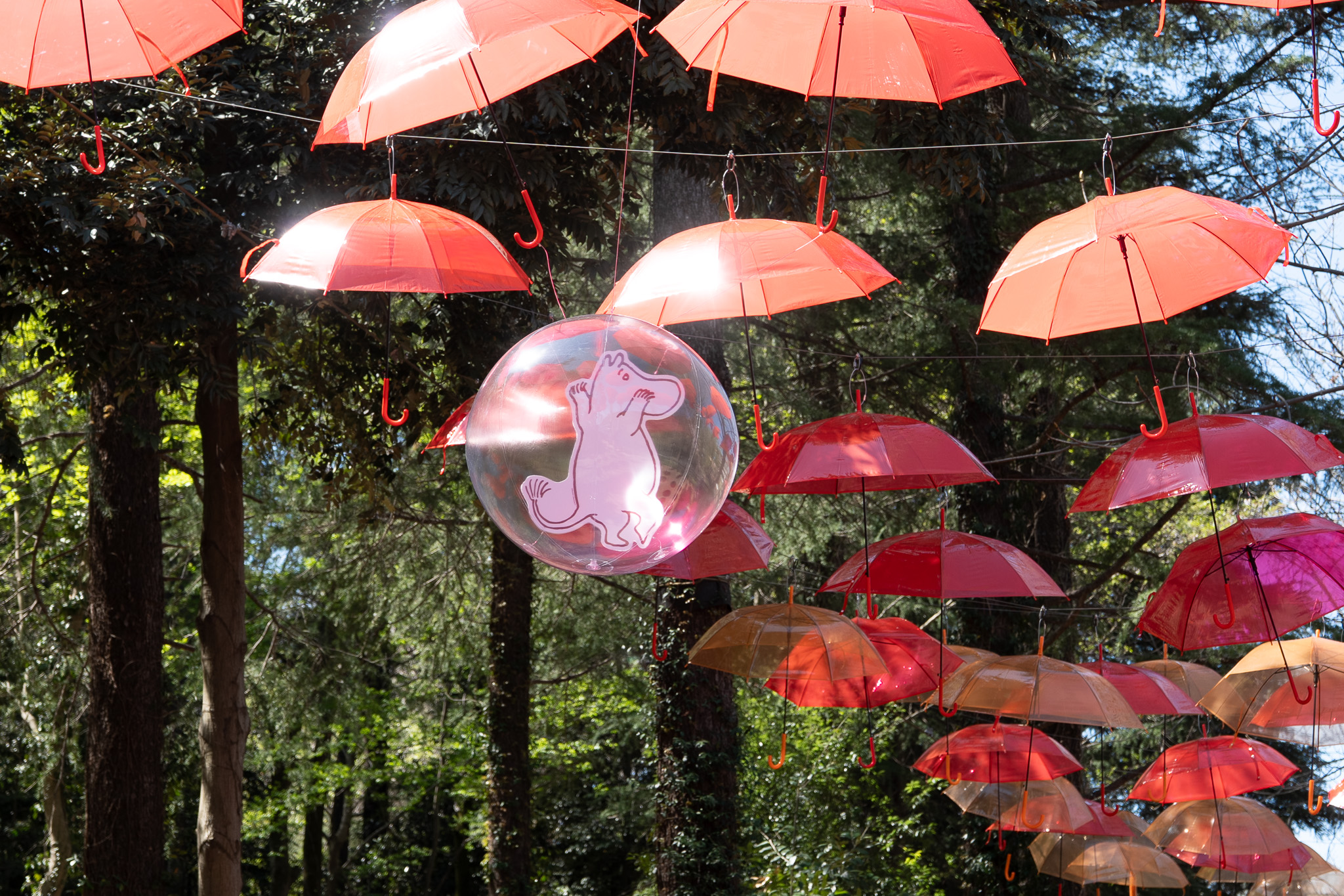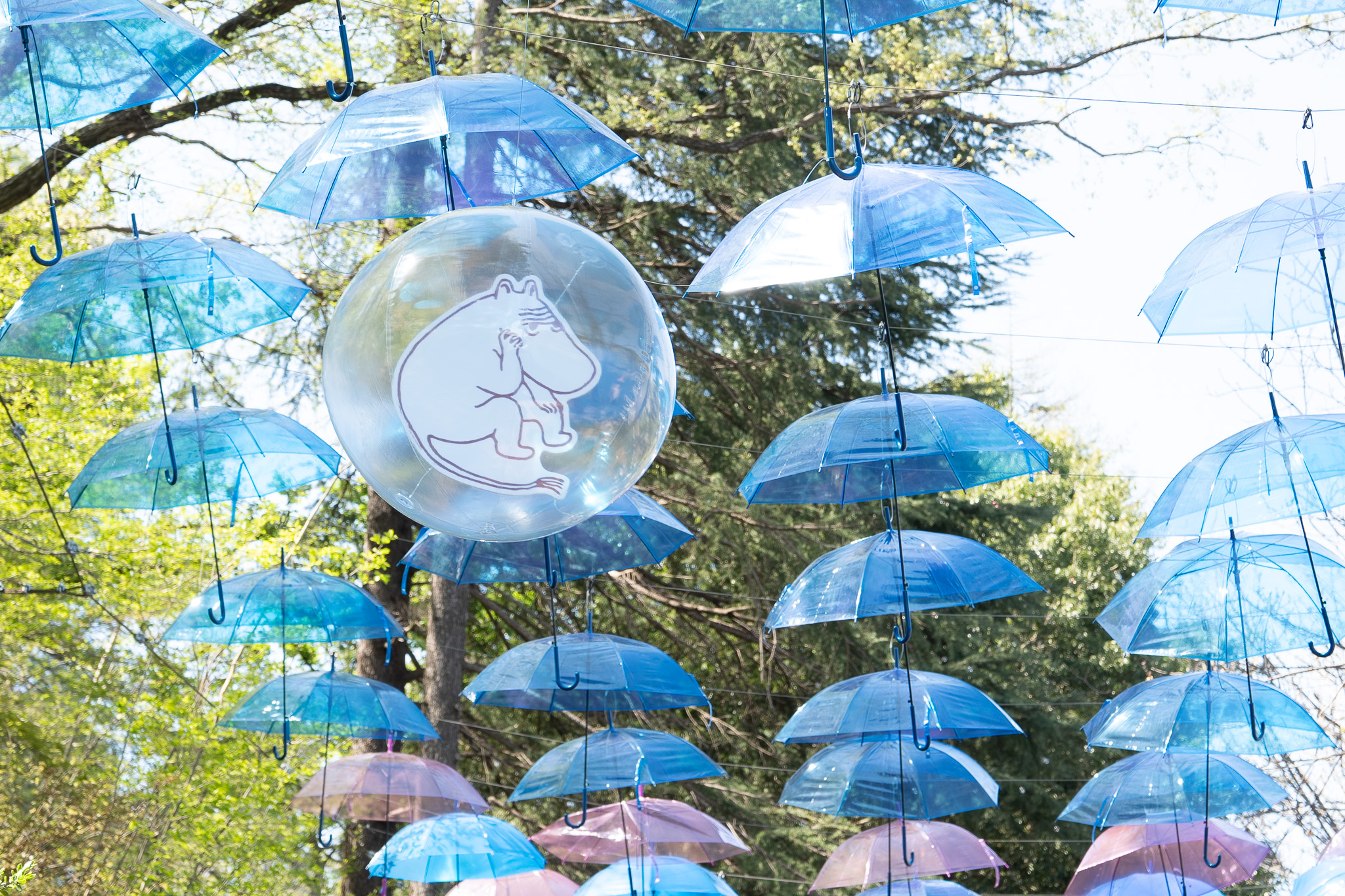 頭上を見上げると、カラフルな傘の中にムーミン谷の仲間たちのキャラクターパネルを配したバルーンが浮かび、まるで物語の中に迷い込んだかのよう 。