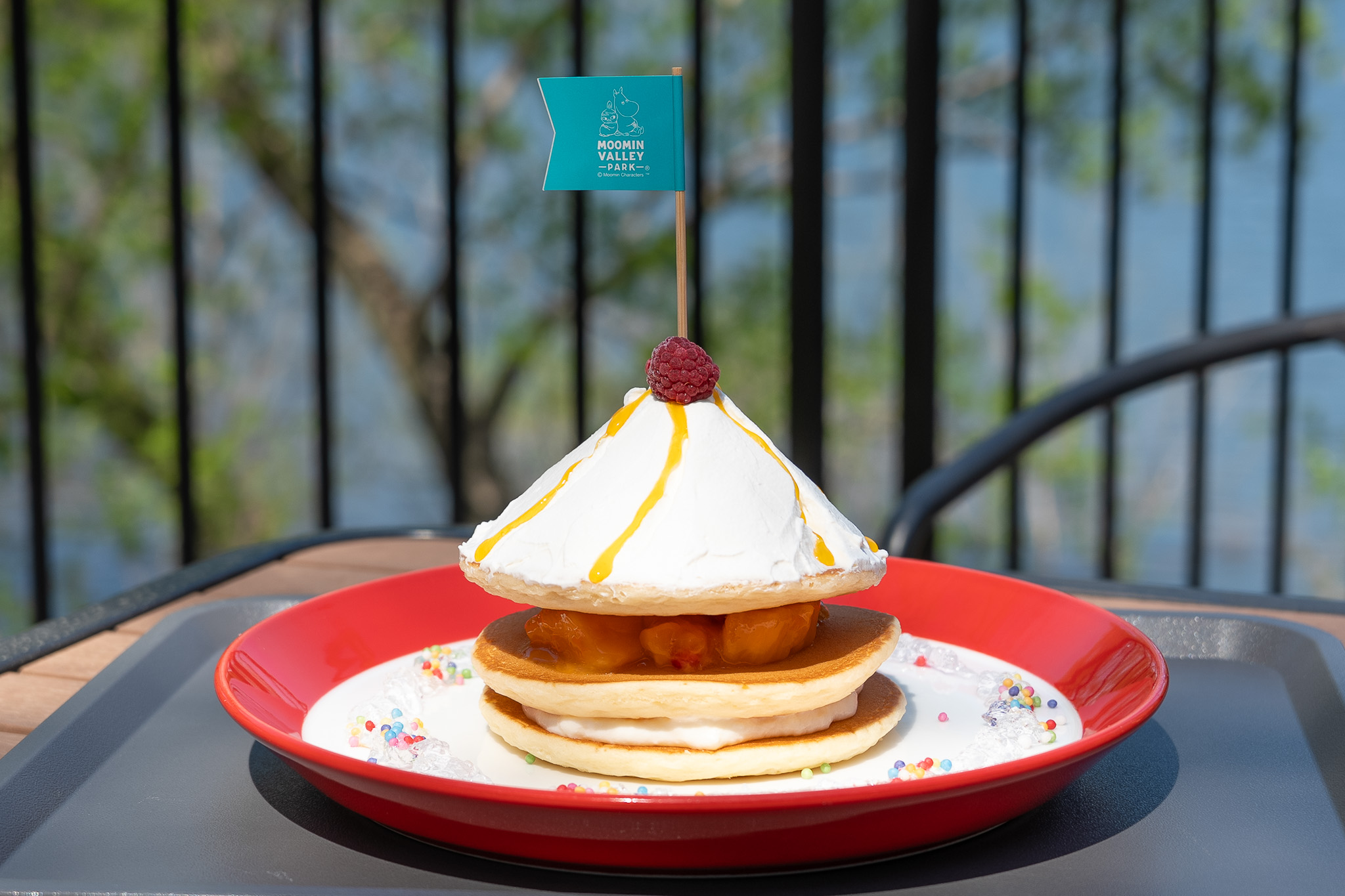雨粒きらめく マンゴーアンブレラ パンケーキは、まるでリニューアルオープンした、「エンマの劇場」にも見えます。可愛らしい三角の上には、ムーミンバレーパークの旗が誇らしくはためいています。