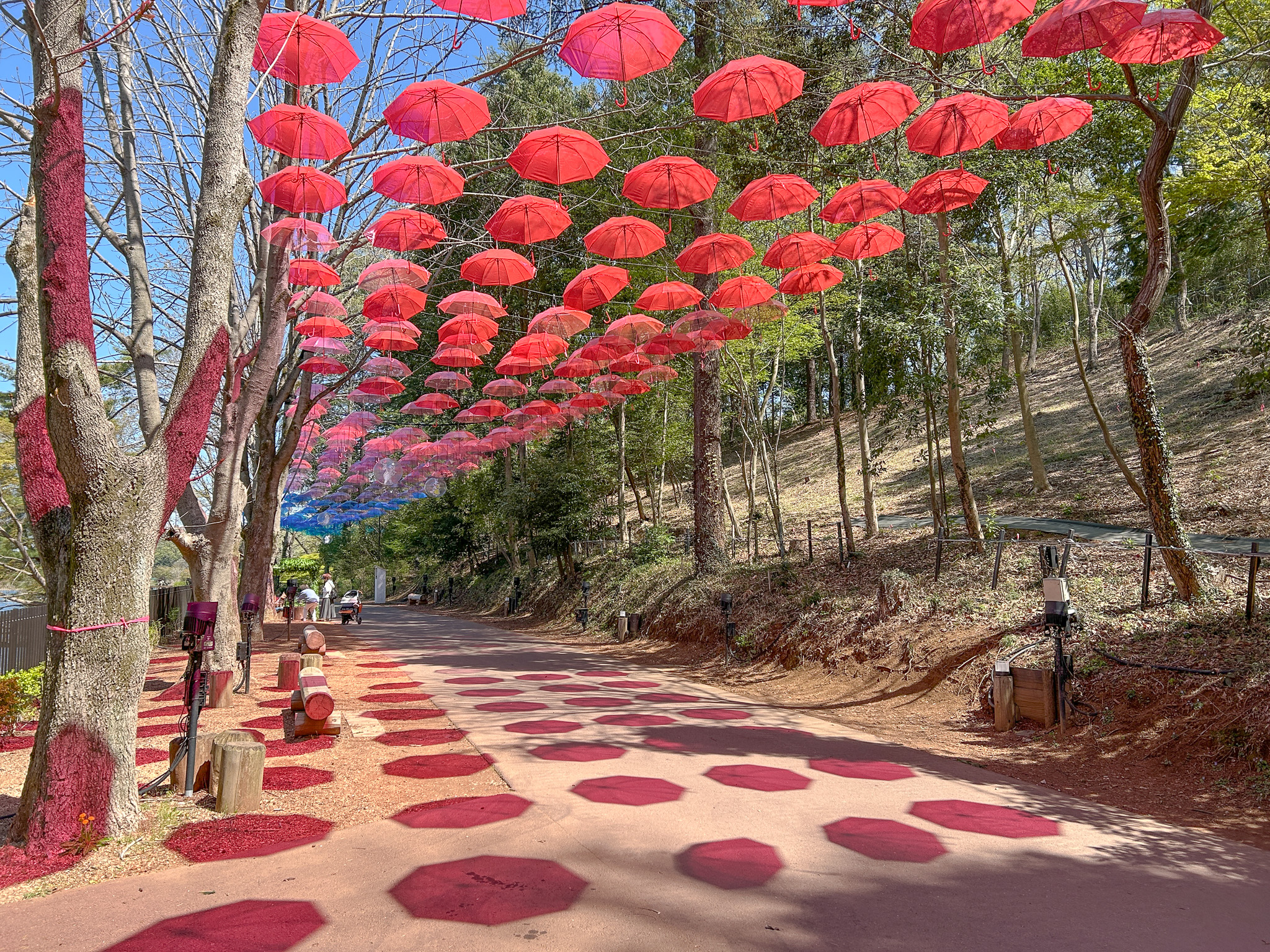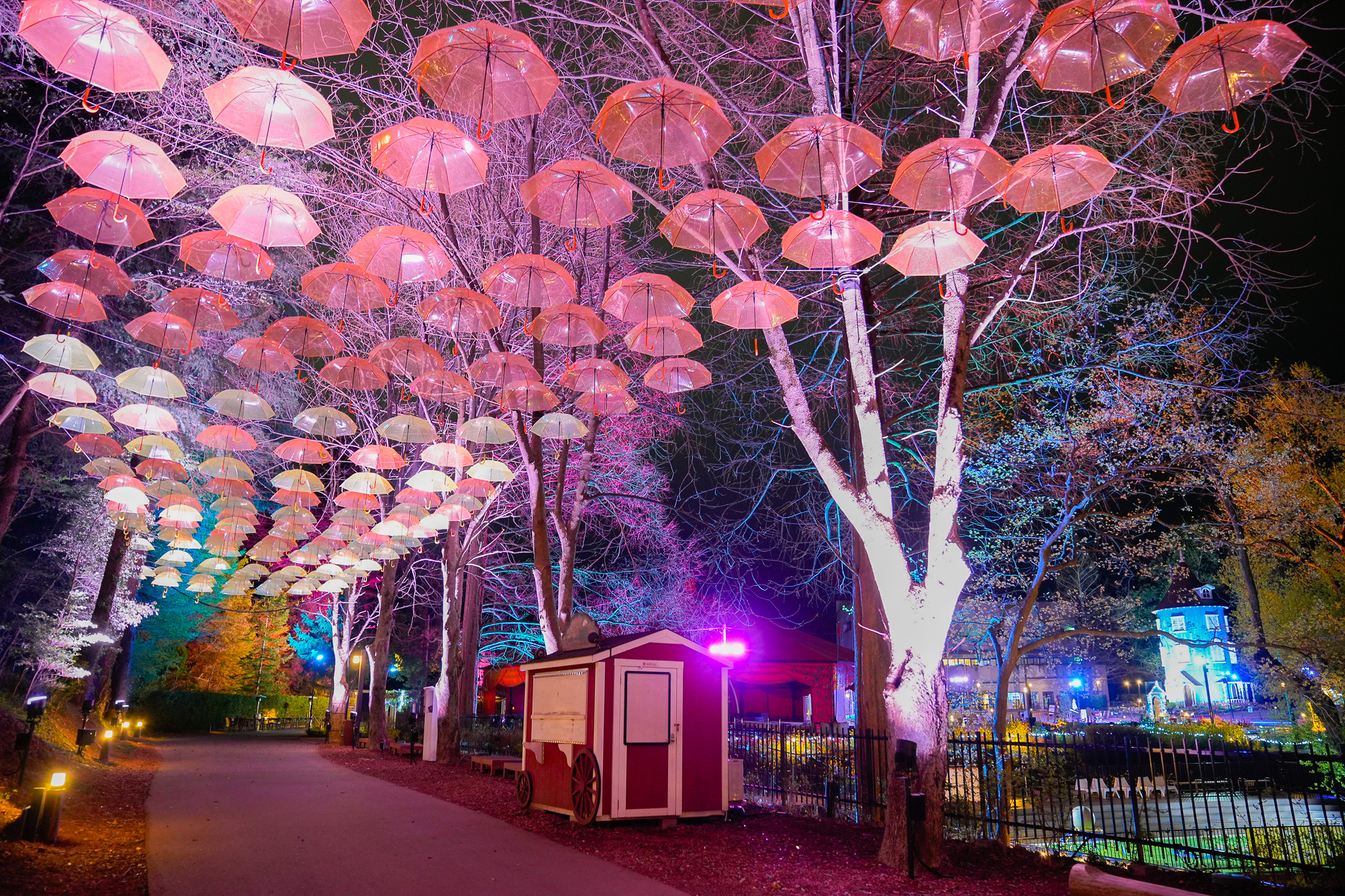 • アンブレラスカイロードの対岸の小径:木々を照らす色が変化し、彗星が流れていくような幻想的な光景を楽しめます 。