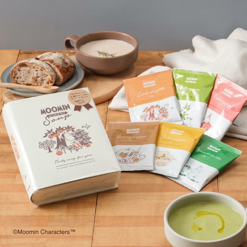 - ムーミン&テーブル 6種類のスープ ギフトボックス(2,484円・税込) 北欧で親しまれている本格的なスープ6種類を詰め合わせたブック型ボックス。お湯を注ぐだけで手軽に本場の味わいを楽しめます。